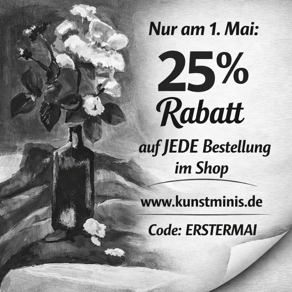 Der Versand der Kunst-Minis erfolgt mit Deutsche Post oder DHL ab €4,00 je Bestellung. Ab einem Bestellwert von EUR 30,00 versende ich die Kunst-Minis für Sie kostenlos.